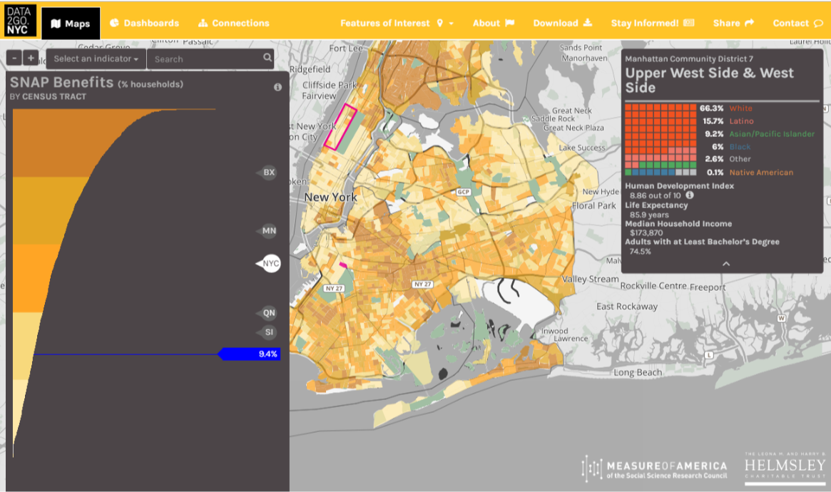 Measure of America’s core mission is to provide easy-to-use yet methodologically sound tools for understanding well-being, opportunity, need, and inequality. This exciting project will build upon MOA’s mapping website, online apps, and previous reports to paint a detailed portrait of America’s largest city in a new, highly interactive way.
